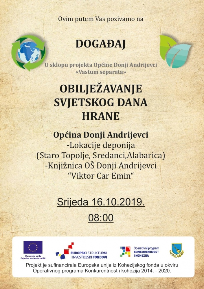 U obilježavanju Svjetskog dana hrane 16.10.2019. godine sudjelovali su učenici 4. i 6. razreda osnovne škole ''Viktor Car Emin''. Teme koje su bile predmet obilježavanja su „Hrana preduvjet ljudskog opstanka i blagostanja te temeljna ljudska potreba“ te „Vastum Separata i čuvam okoliš“. Prije radionica koje su se održale u knjižnici osnovne škole, djeca su prikupila otpad na tri lokacije: Staro Topolje, Sredanci i Donji Andrijevci. Od prikupljenog otpada izrađivali su stalak za biljke. Pobjedu su u natjecanju odnijele djevojčice, no i dečki su pokazali iznimnu kreativnost i natjecateljski duh. Tijekom obilježavanja događaja održana je lutkarska igra ''Razgovor dvije vreće za smeće'' koje su pripremile učenice 4. razreda.